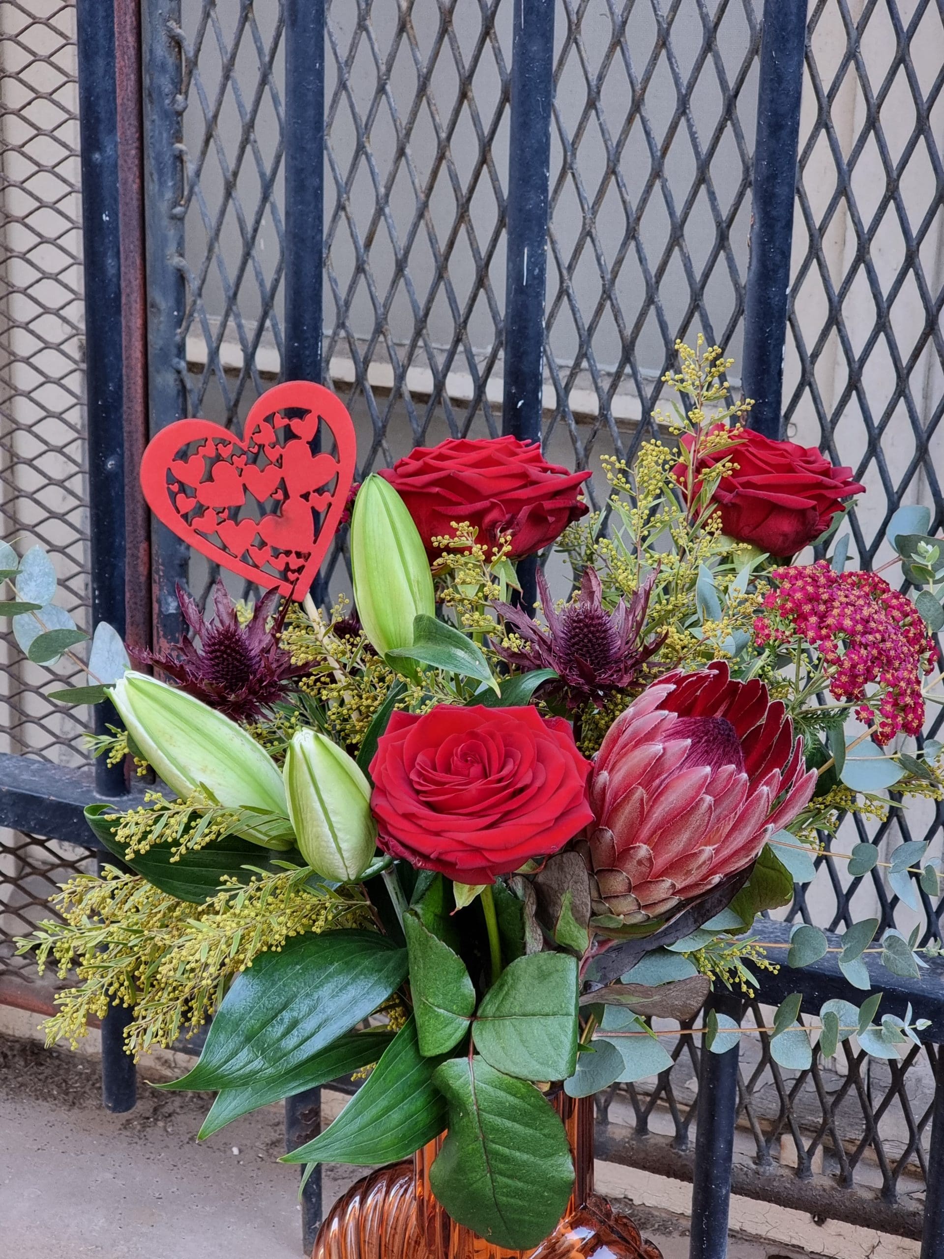 Un lys blanc, 3 roses rouges, accompagnés de fleurs de saison.