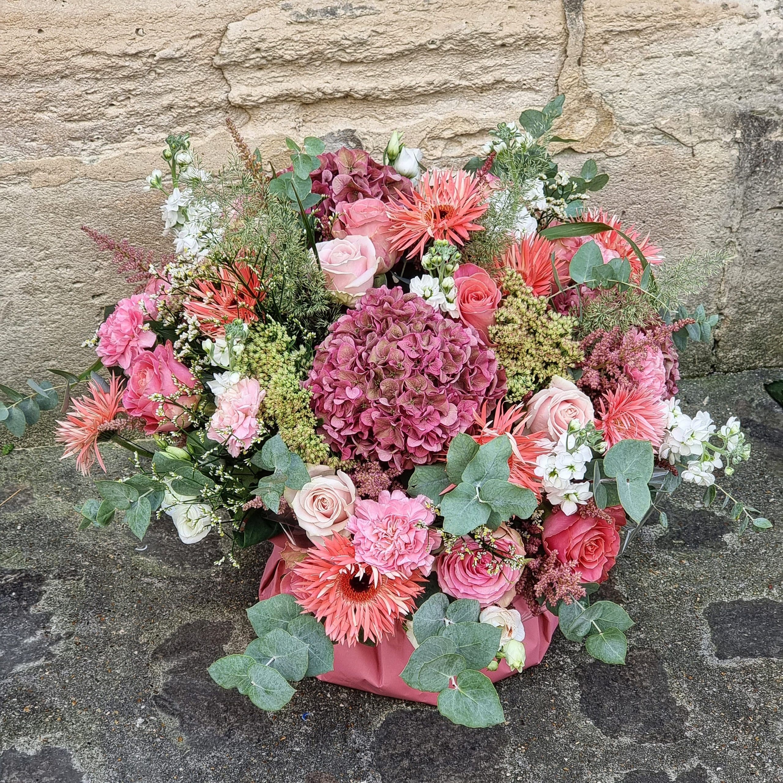 Bouquet de fleurs réalisé avec des fleurs de saisons, et présenté dans une bulle d’eau