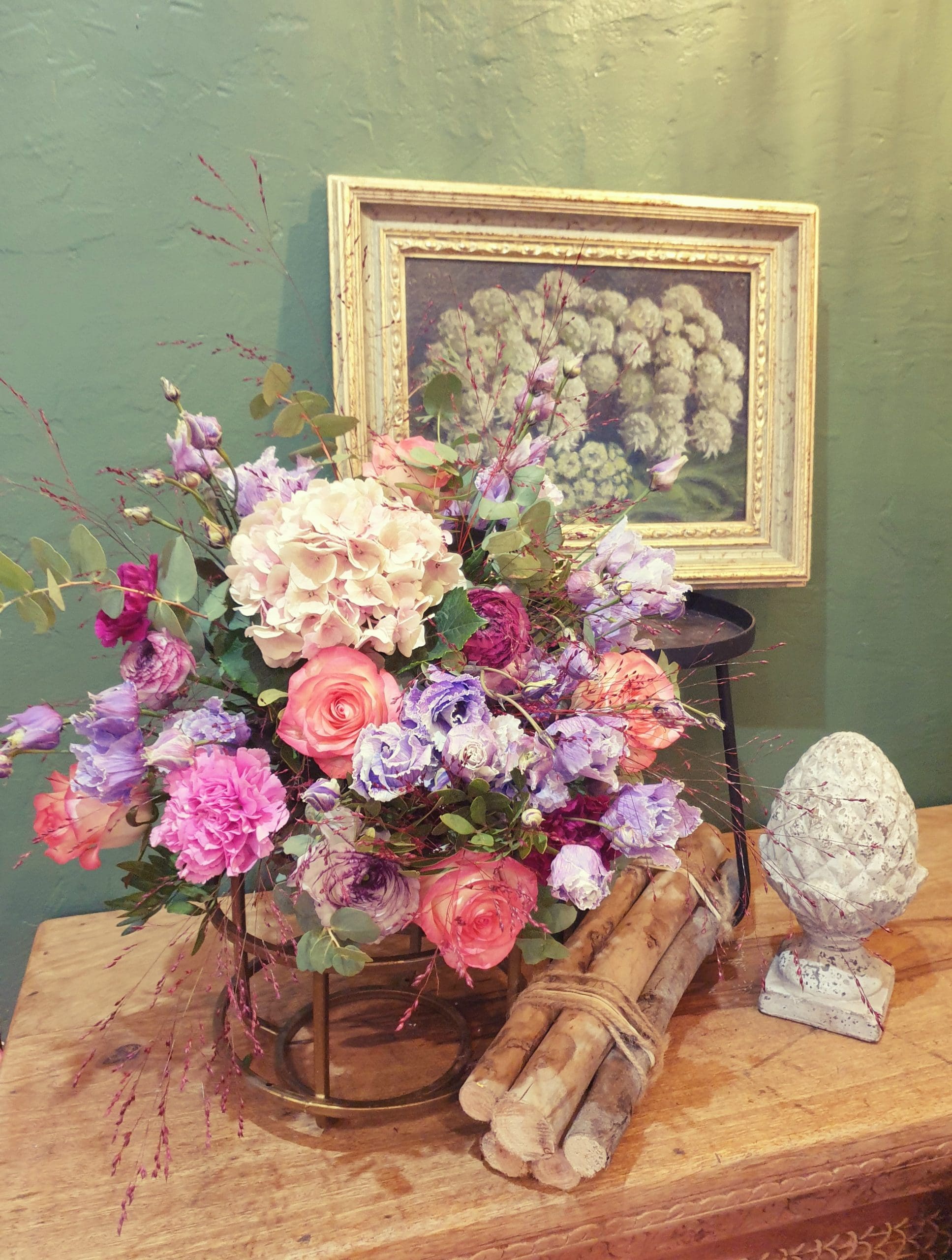 Nous vous proposons un joli bouquet pastel confectionné avec des roses, des fleurs champêtres, du lysianthus, un hortensia, des œillets de Hollande et de l’eucalyptus du midi.